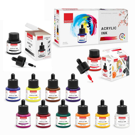 Isomars Acrylic Inks with Dropper- Set of 12 Colors - Professional