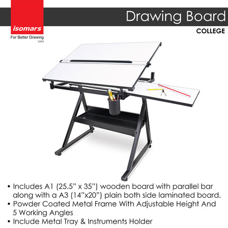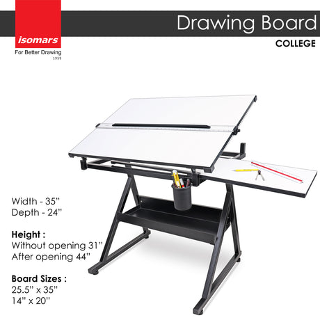 Isomars Drawing Table (College) - with White 25.5" x 35" Drafting Board and 14" x 20" Sliding Board