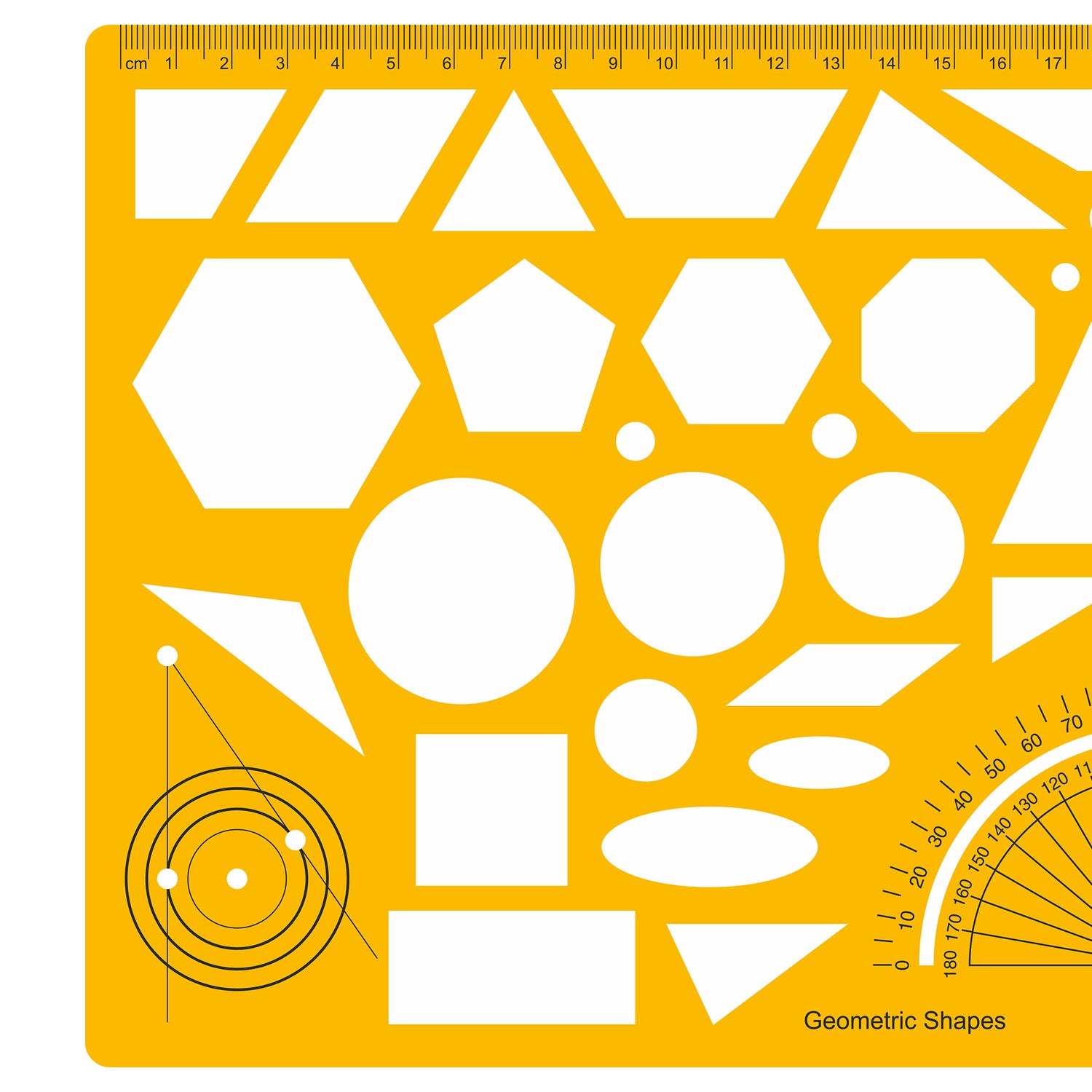 Transform your technical drawings and design work with the Isomars Geometric Shapes Drawing Template. This professional drafting tool combines versatility and precision, featuring a comprehensive array of geometric shapes and a built-in protractor for accurate angle measurements. The durable yellow template includes various sized circles, triangles, squares, hexagons, and other essential geometric forms, making it perfect for architects, engineers, students, and design professionals. The clear, precisely cut shapes allow for easy tracing and consistent results every time. The integrated ruler markings help maintain precise measurements throughout your work. This template serves as an invaluable aid for technical drawings, architectural plans, engineering diagrams, and educational purposes. The ergonomic design ensures comfortable handling during extended use, while the high-quality construction promises longevity. Whether you're creating technical illustrations, teaching geometry, or working on professional drafting projects, this template delivers the accuracy and efficiency you need.